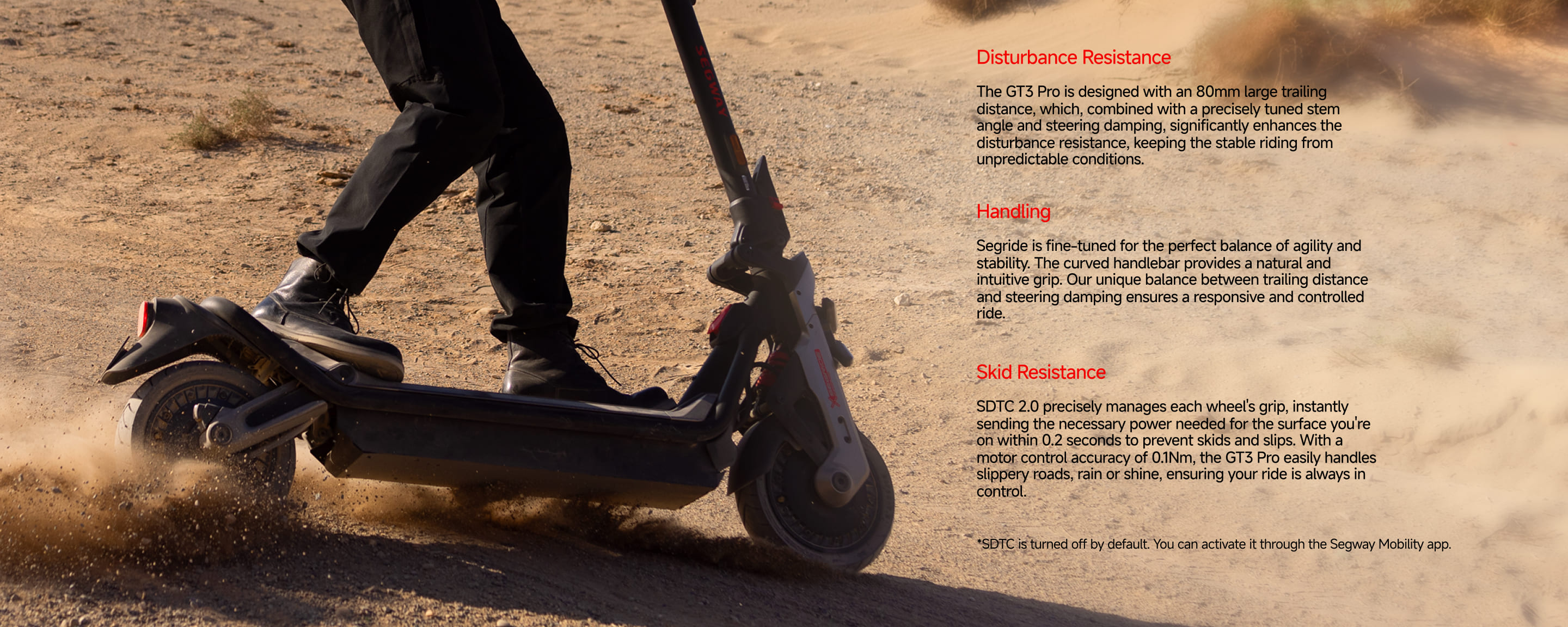 Enjoy the advanced Segway-Ninebot technology SegRide™ Stability Enhancement System that improves control in difficult riding situations, especially at high speeds, aggressive turns, and on slick roads.